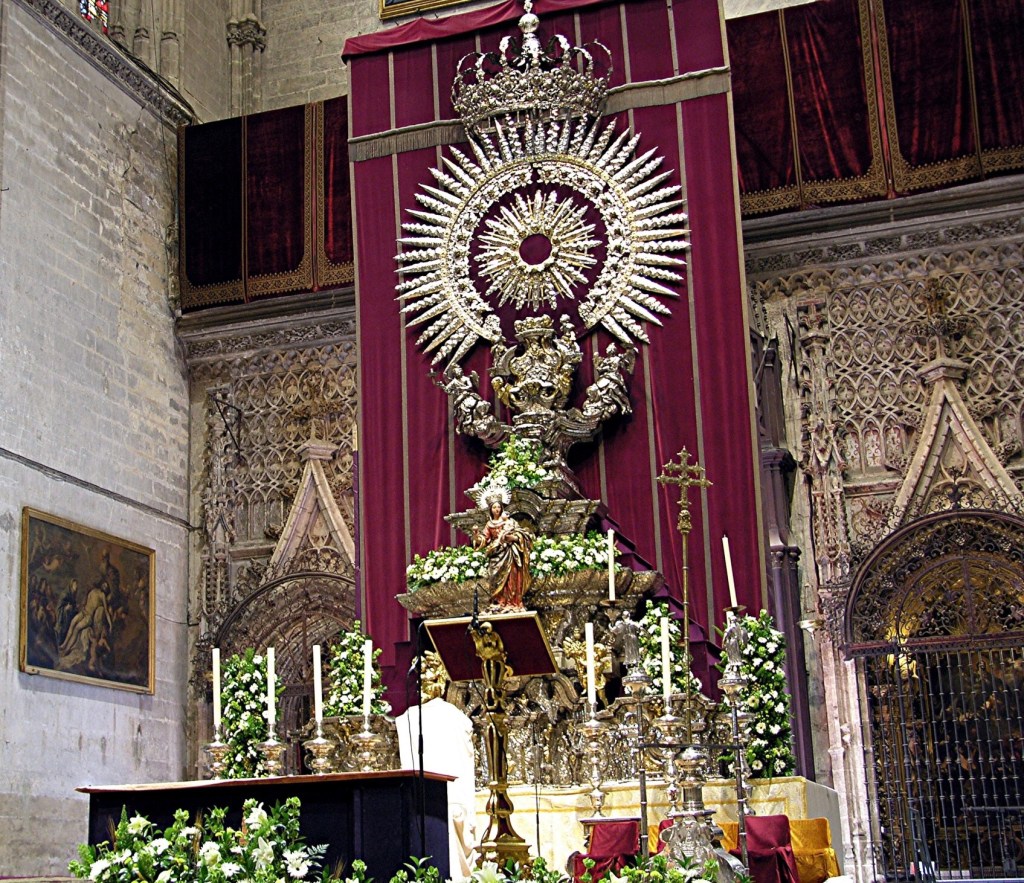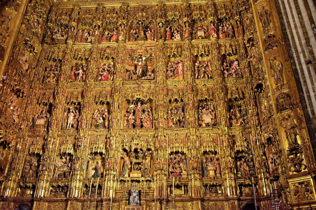 It’s High Altar reredos, depicting 44 scenes from the life of Jesus and Mary, is 65 feet tall and made of walnut and chestnut and covered with gold leaf.